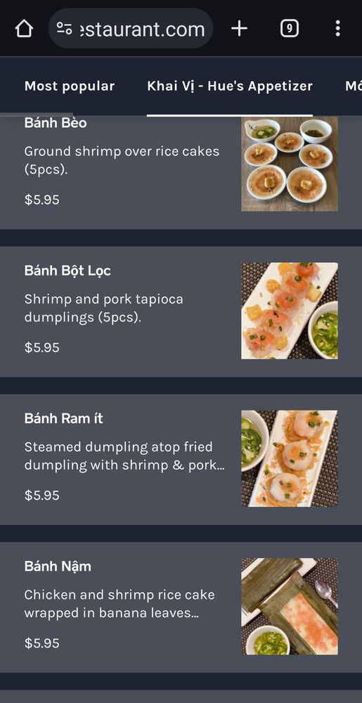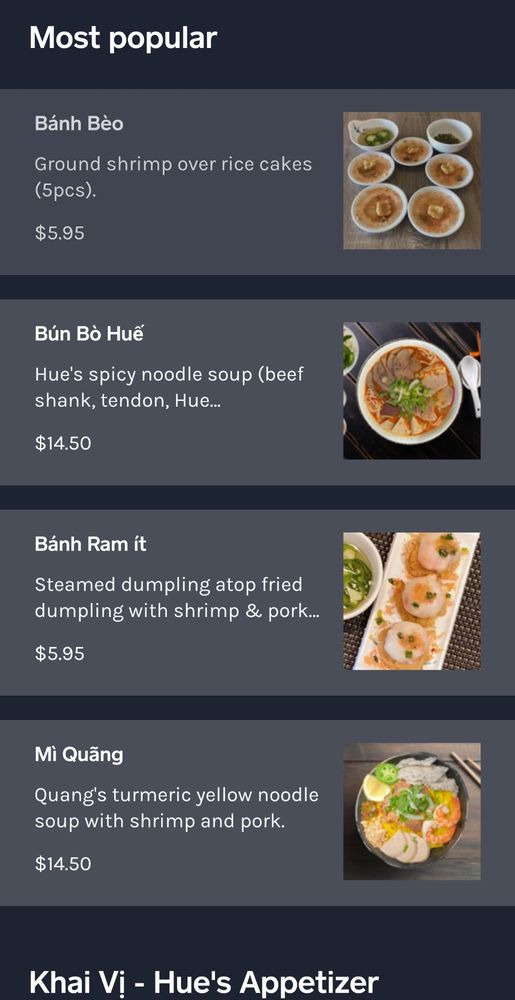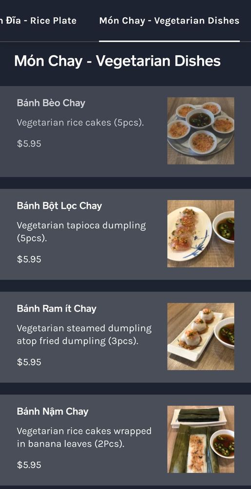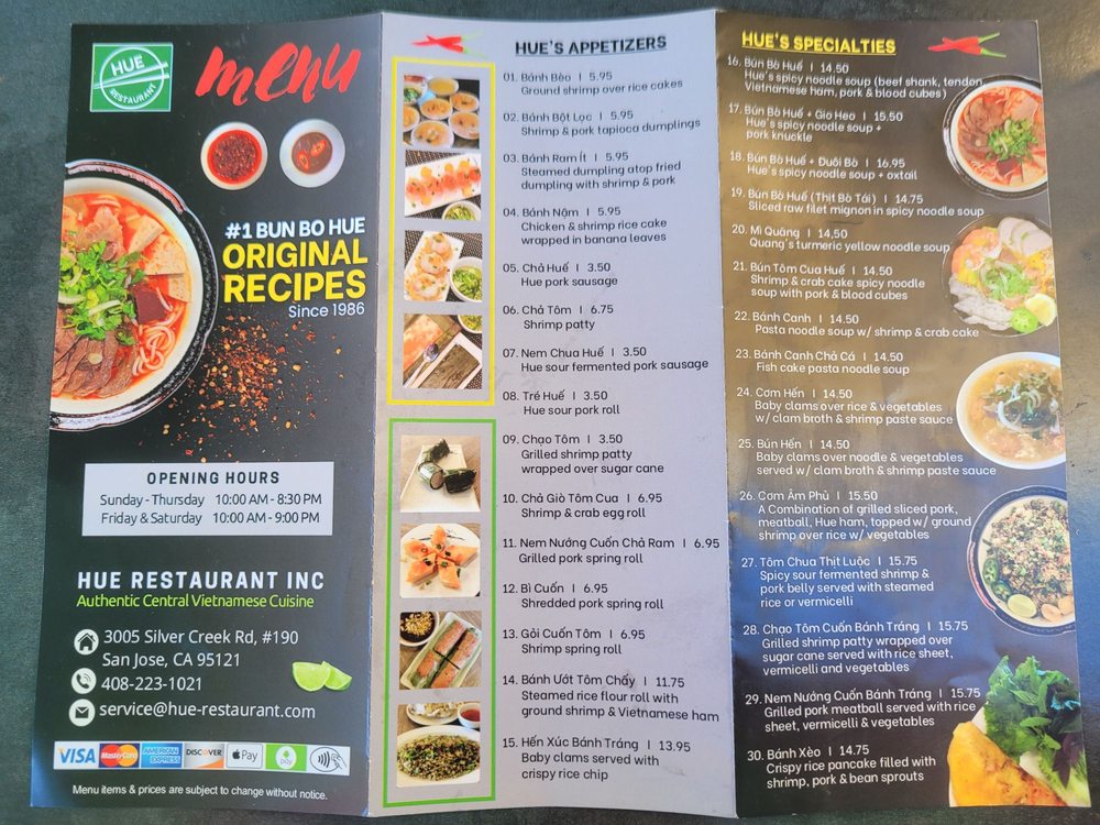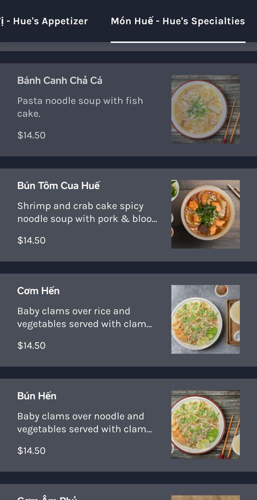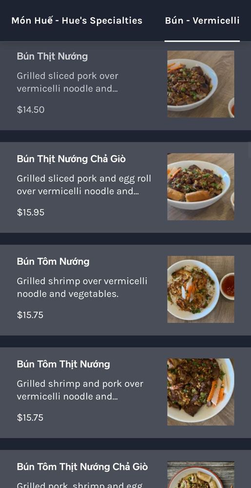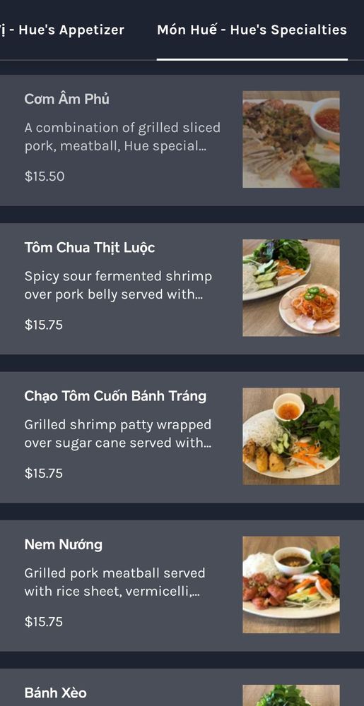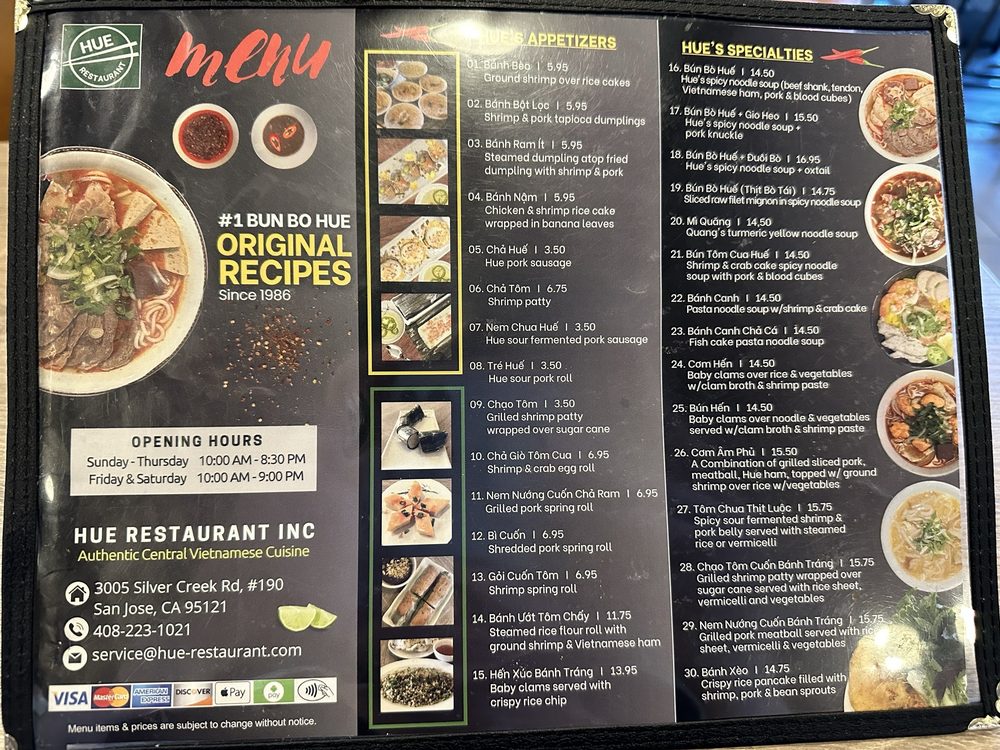 Introducing the menu at Hue Restaurant, a renowned spot in San Jose known for its central Vietnamese cuisine. With a focus on dishes like banh beo, bun bo hue, and com tam thit nuong, Hue offers a wide array of options for both meat lovers and vegetarians. The restaurant boasts spacious seating, fast service, and a casual atmosphere perfect for families or group outings. Customer favorites include the addictive banh beo appetizer and the flavorful bun bo hue soup. The menu also features options for delivery, catering, and happy hour deals. With a history of excellent service and top-notch food quality, Hue Restaurant stands out as a must-visit destination for lovers of authentic Vietnamese flavors.